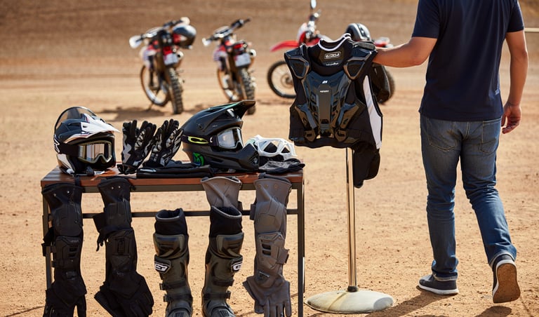 casque, gilet avec dorsale, gants, genouillères, bottes.